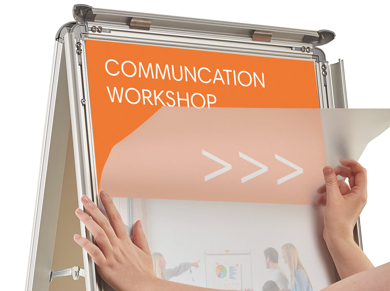 - • Simply lift up all four sides of the Nobo A0 A-Frame (Not Included) and insert the Blackboard sheet, replace the PVC cover, then 'snap' shut.