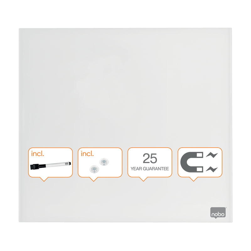 - • Contents: 1 x Nobo Glass Magnetic Whiteboard, mounting kit, 1 x glass board marker, 2 x magnets, White, 1903957 Dimensions (H x W): 450 x 450mm, Weight: 3.12kg