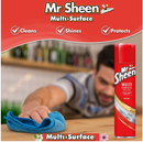 Mr Sheen multi-surface aerosol polish spray cleans, shines and eliminates dust on a variety of surfaces including metal, wood, glass, and melamine. 250ml.