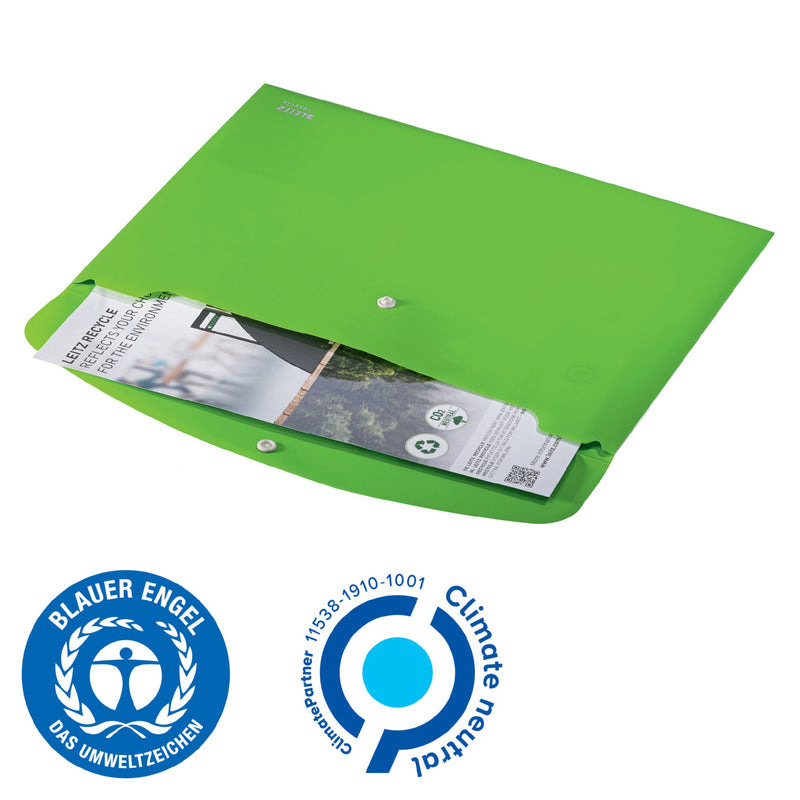 Eye-catching, premium quality PP Document Wallet for every day use in school, office and home with push button closure to prevent documents from sliding out. Made from 80% recycled plastic, climate neutral, 100% recyclable and with Blue Angel environmental certification. This robust and practical document wallet perfectly complements other products from the Leitz Recycle range and is made to last. Modern and contemporary green stationery that will look great at home and in the office. With the eco friendly Recycle range from Leitz you can both improve your office environment – and the environment of our planet.