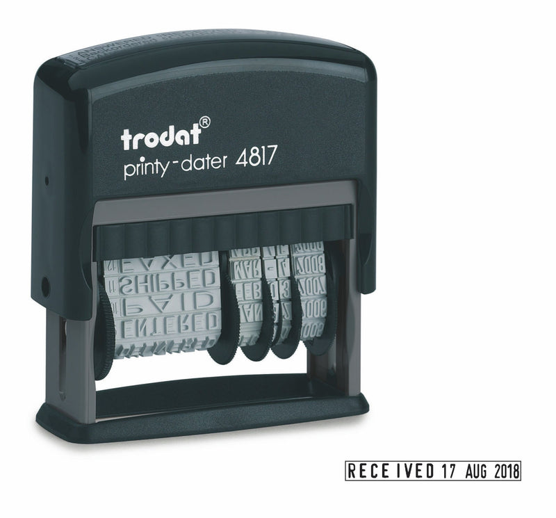 A fantastic addition to any office where documentation needs to be carefully accounted for, the self-inking Trodat Printy Dater 4817 stamp provides 12 commonly used office phrases alongside the date for clear and easy to read impressions. The durable stamp is comfortable for everyday use in a busy working environment. Featuring wheels that allow you to change the wording and date, this easy to use stamp gives you 12 different office applications in one handy stamp. The impression size is 25 x 7mm, the date is 3.8mm in height with the format day. month (in letters) and year. Climate neutral as standard, the stamp is made from up to 70% recycled material. Phrases include; Answered, Received, Entered, Backordered, E-Mailed, Paid, Cancelled, Checked, Shipped, Billed, Deliveredand Faxed.