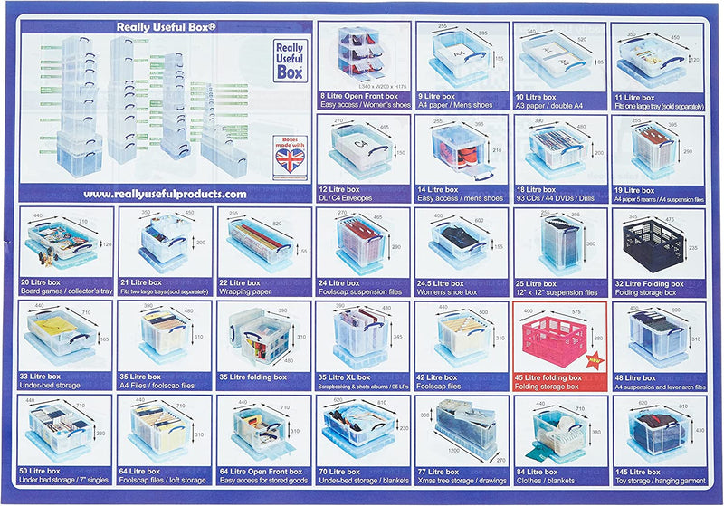 This Really Useful storage box is suitable for A4 suspension files for handy filing and storage in the office or at home. The box is made from durable polypropylene with a separate lid and integrated carry handles. Stackable and stable, this clear storage box has a 19 litre capacity and measures W375 x D255 x H290mm.