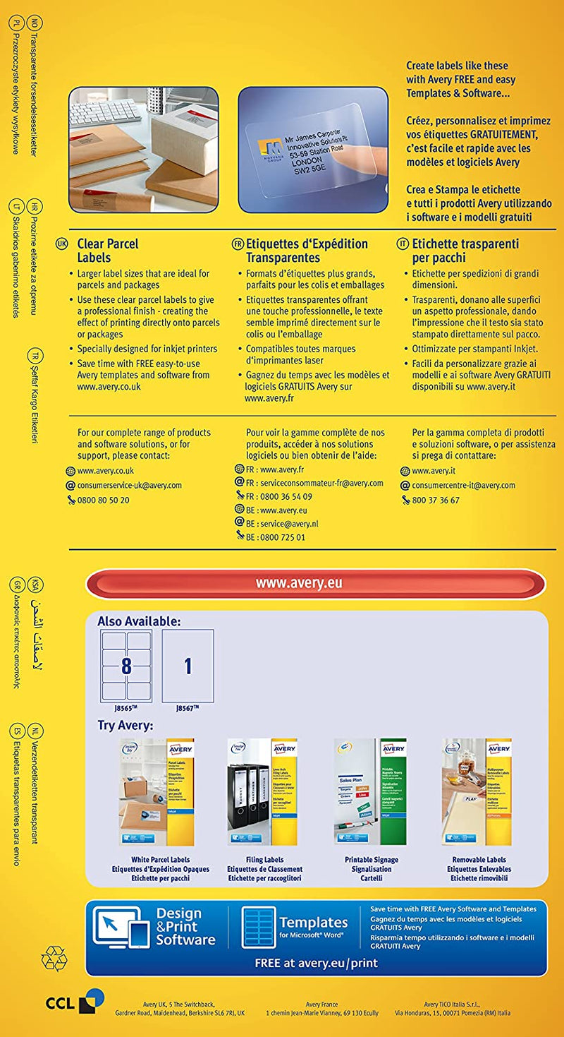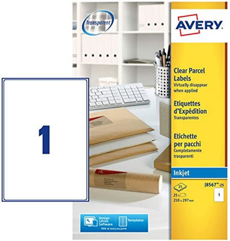 Avery Self Adhesive Clear Parcel Address Labels, Inkjet Printers, 1 Label per A4 Sheet, 25 Labels, QuickDRY (J8567)