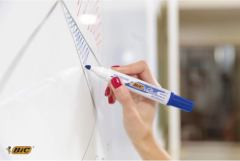 These Bic Velleda Whiteboard Markers feature ketone-based ink that glides on smoothly and erases just as easily, and is low odour to ensure comfort when writing extensively. It features a strong acrylic tip that will not bend or retract into the barrel, even with heavy use. The bullet tip writes a consistent bold line for ease of use.