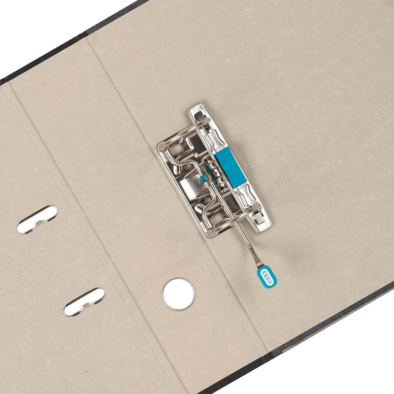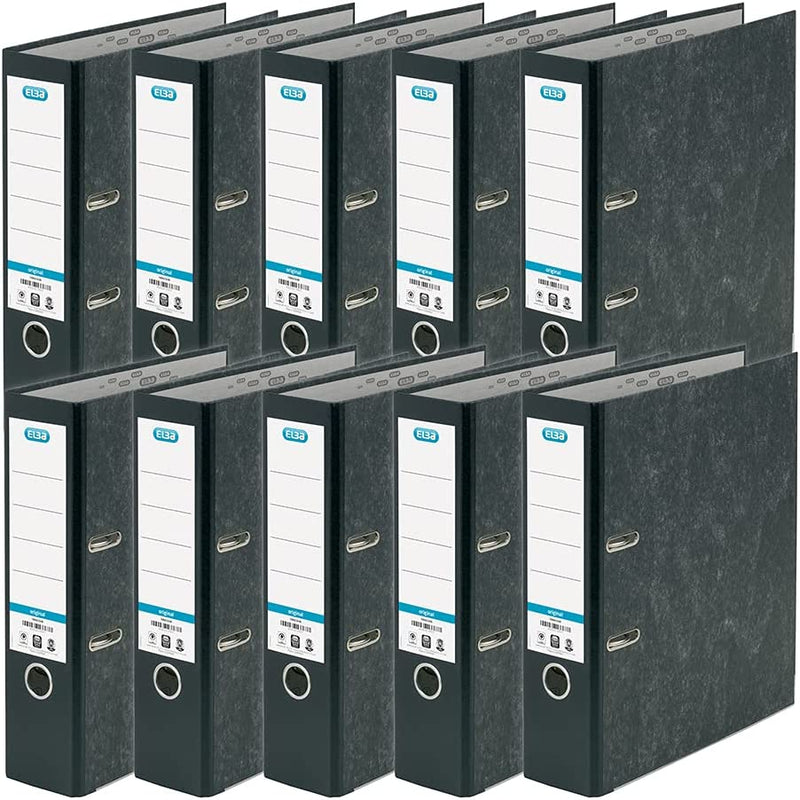 This Elba Lever Arch File, suitable for filing A4 documents. It has a 80mm filing capacity and features a thumb hole for easy retrieval from a shelf and a reinforced bottom edge for long lasting use. The lever arch file is made from durable board with a marbled black paper covering. This pack contains 10 A4 lever arch files.