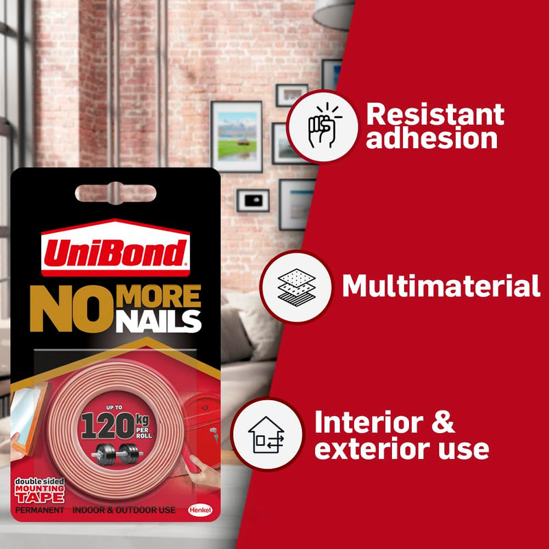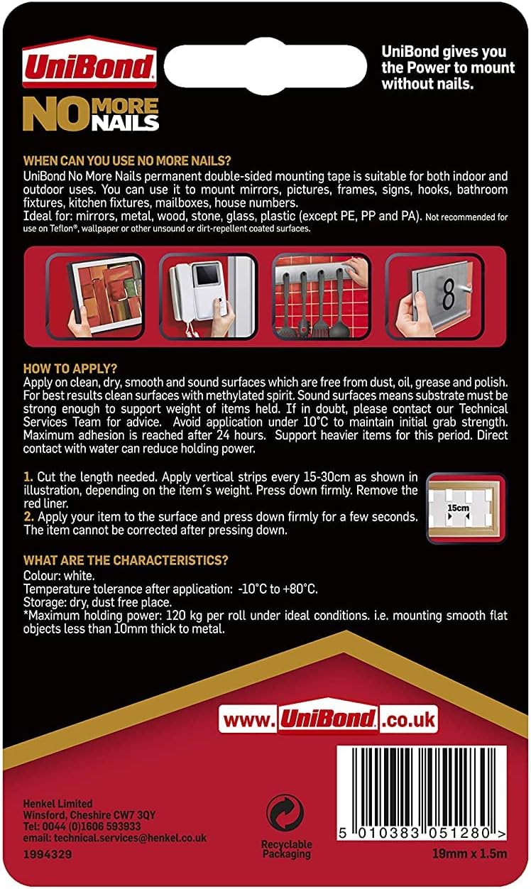 High strength permanent adhesive with superior grab strength that eliminates the need for nails, screws and plugs in many DIY, building, crafting and repairing jobs. No More Nails Ultra Strong will hold up to 120kg per roll. For both interior and exterior use, No More Nails is ideal for use on wood, ceramic tiles, metal, brick, stone, plaster and most plastics. This pack contains 1 roll measuring 19.5mm wide and 1.5m long.