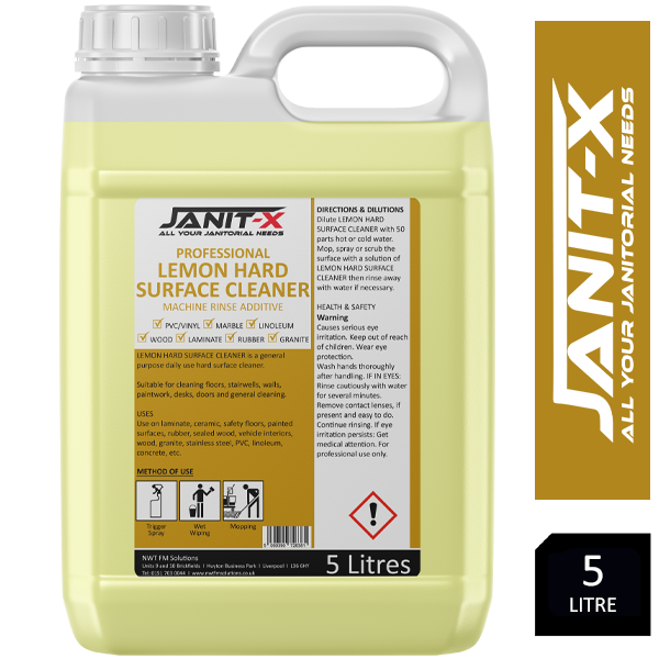 Dilute Janit-X Professional Lemon Scented Hard Surface Cleaner 5L with 50 parts hot or cold water. Mop, spray or scrub the surface with a solution of LEMON HARD SURFACE CLEANER then rinse away with water if necessary.