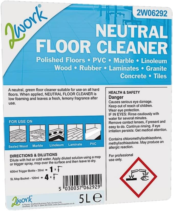 Get floors clean to a sparkling finish with this Professional Grade Neutral Floor Cleaner. Use when mopping, or as a spray cleaner for tough and effective cleaning. It cleans evenly without patches or smearing, with a low-foaming, quick-drying formula that cuts drying time for easy application. After cleaning, it leaves behind a pleasant lemon-scented fragrance. This 5 litre bottle contains a concentrated formula for dilution with mop buckets or spray bottles.