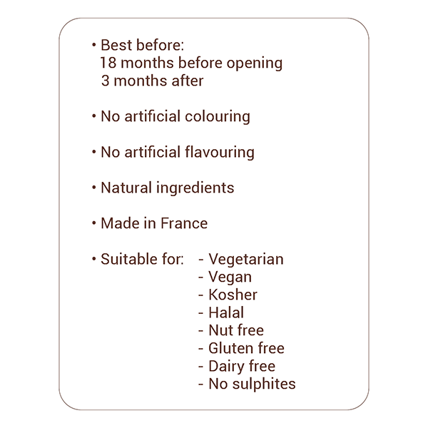 • Suitable for vegan, vegetarian diets. Alcohol-free, Halal, Kosher. Natural flavourings.