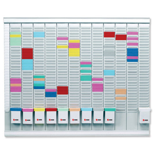 This Nobo T-Card Planning Kit has all you need to create a durable and effective 12 month planner, with the flexibility to plan monthly, annually or simply by project. It is ideal for organising your office and managing daily or weekly meeting plans. This kit contains 12 panels with 32 slots for size 2 T-Cards. It has an index panel, also with 32 slots for size 1 cards for the date or time. There are 2 aluminium rails plus 4 pairs of coloured title strips to write names or meeting rooms for a more organised approach when planning. There are 10 boxes of 100 size 2 T-Cards, which come in assorted colours and a box of 100 size 1 T-Cards to get you planning straight away.