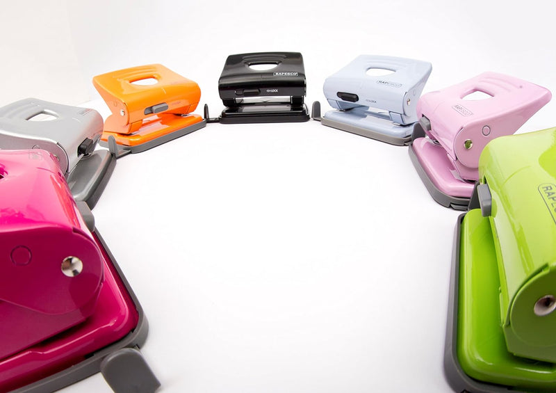 Rapesco 825 Metal Punch offers tough metal working parts, precision pressed handles, hardened cutter, handle lock-down and metal base fitted with a rubberised flip down confetti tray as standard. Personalisation window allows for easy identification. 2-hole punch with 25 sheet capacity, enough for most applications.