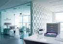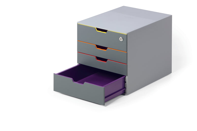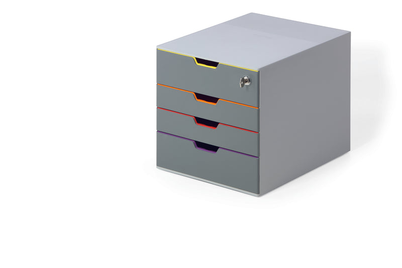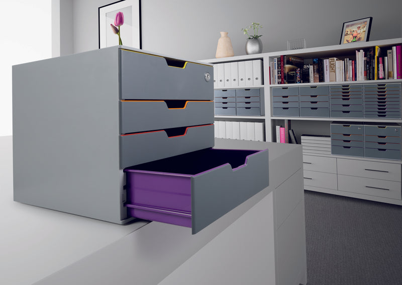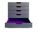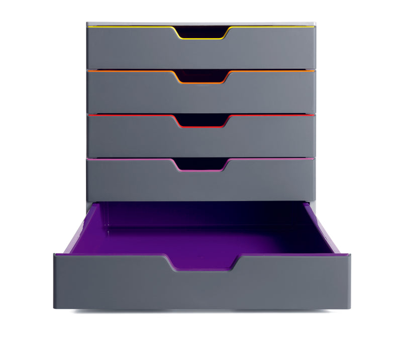 Stylish drawer box with five colourful drawers made from premium quality plastic. Each drawer is a different colour making it easy to organise documentation. The drawers open smoothly and include drawer stops. Featuring transparent labelling windows and EDP-printable label inserts which are and easy to exchange. These stackable sets include plastic feet to prevent skidding. Suitable for holding A4, C4, folio and letter size formats, the drawer unit measures W292 x D356 x H280mm.