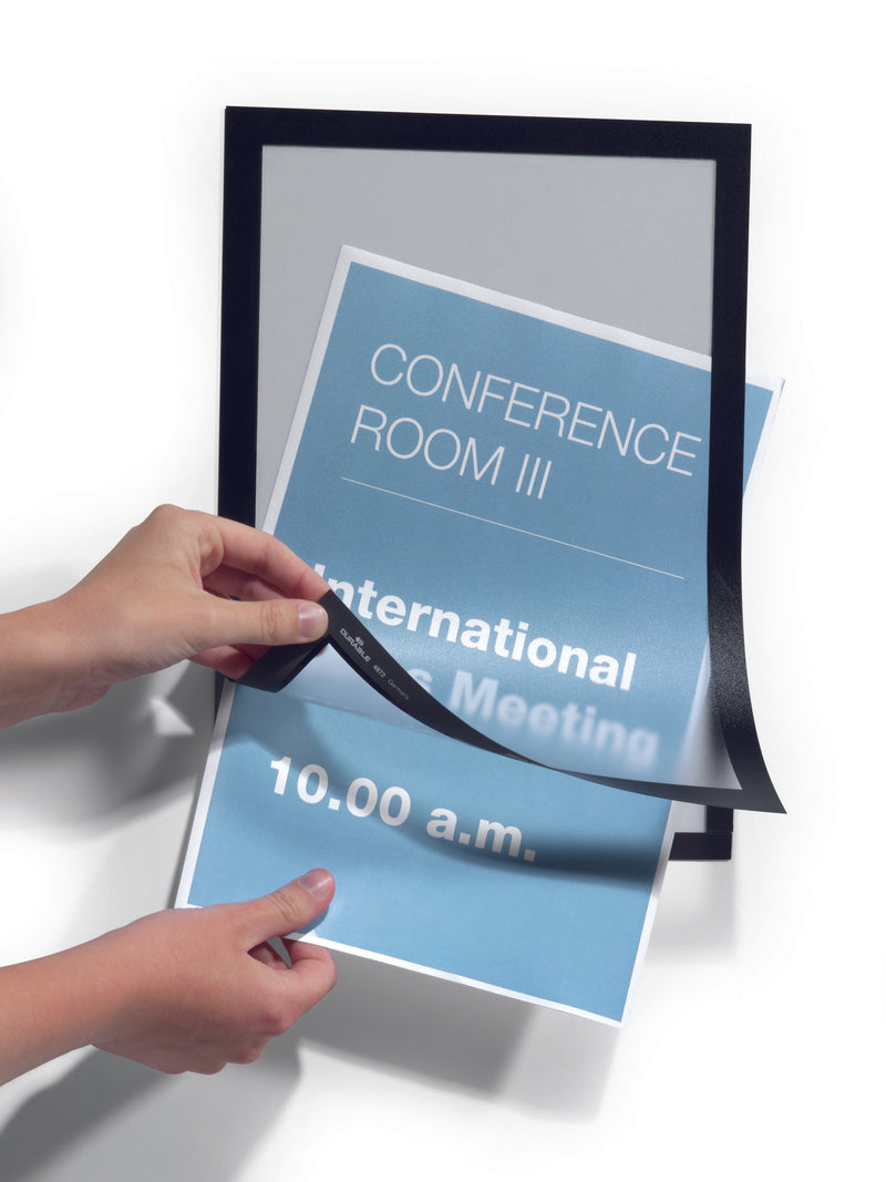 The self-adhesive info frame DURAFRAME is the ideal solution for displaying information on solid and smooth surfaces. The inserts can be quickly exchanged thanks to the magnetic fold-back frame. When applied to glass, the information can be read from both sides and will leave no residue when removed. Perfect for displaying notices, signage, safety information in any workplace or at home.