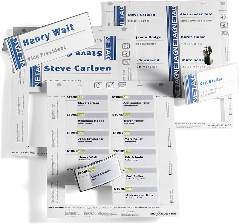 These Durable Badgemaker insert sheets allow you to create professional name badges. Ideal for events, conferences, meetings, exhibitions and more. The insert sheets are compatible with laser, inkjet printers and photocopiers, and can be printed double sided. The sheets are micro-perforated for easy removal of each badge. Insert size: 54x90mm.