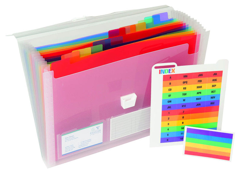 The Exacompta Expanding case is made from 0.7mm clear polypropylene. 33x25cm in size and has brightly coloured pp dividers. The file has an expanding spine and a press stud closure.