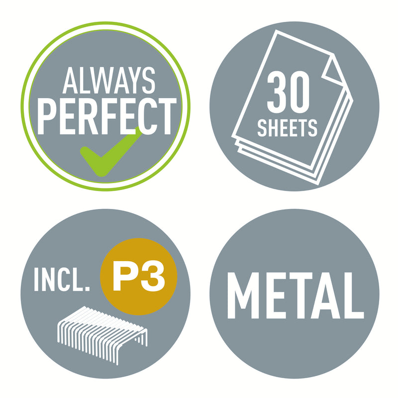 Sturdy metal stapler for everyday use. Robust and reliable. Patented Direct Impact Technology and Leitz Power Performance staples P3 (24/6, 26/6) ensure perfect stapling every time.