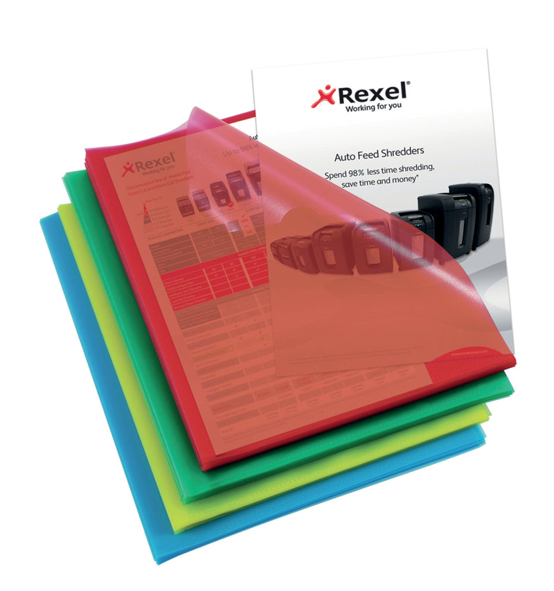 Rexel products are for busy workers, who appreciate the big difference that the application of clever design can bring to everyday tasks. Rexel Quality cut flush folders are ideal for filing and storing frequently reference paper work and handouts. They are made from lightweight Strong 115 micron tear resistant polypropylene. Opens on the top and right side with thumb hole cut for easy access to content. Suitable for use with A4 documents with an embossed anti glare finish to prevents fingerprints or grease marks and is water resistant, making sure your documents stay in pristine condition at all times. Available in a choice of Clear, red, blue, green, yellow or assorted colours for colour coded organisation.