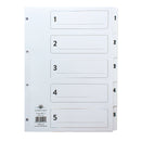 Premium range of white board indexes with clear Mylar tabs and punch holes. Reinforced tabs and punch holes for durability. Contents page for easy titling and cross reference. Ideal for use in all commercial and professional environments. Punched 4 holes. Size: A4. Numbered 1-5.