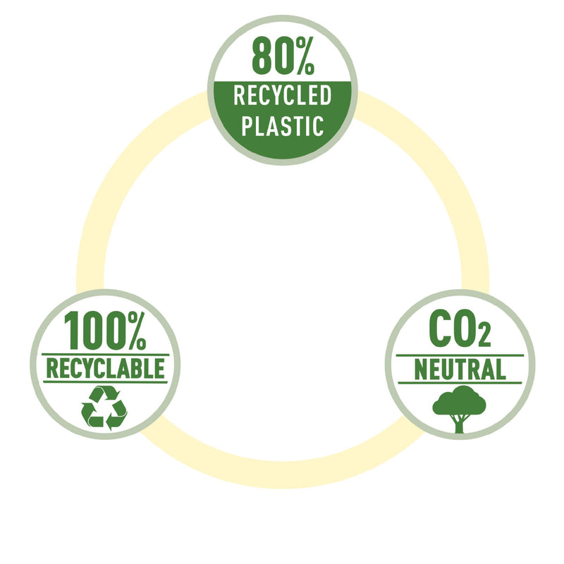 - • Made from 80% recycled (post consumer) plastic, 100% recyclable, climate neutral and Blue Angel certification