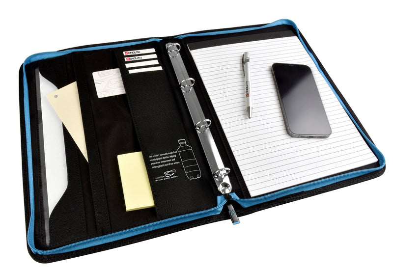 This stylish, modern-design A4 Monolith Blueline zipped conference folder is made from recycled plastic bottles. It comes complete with an A4 pad.
