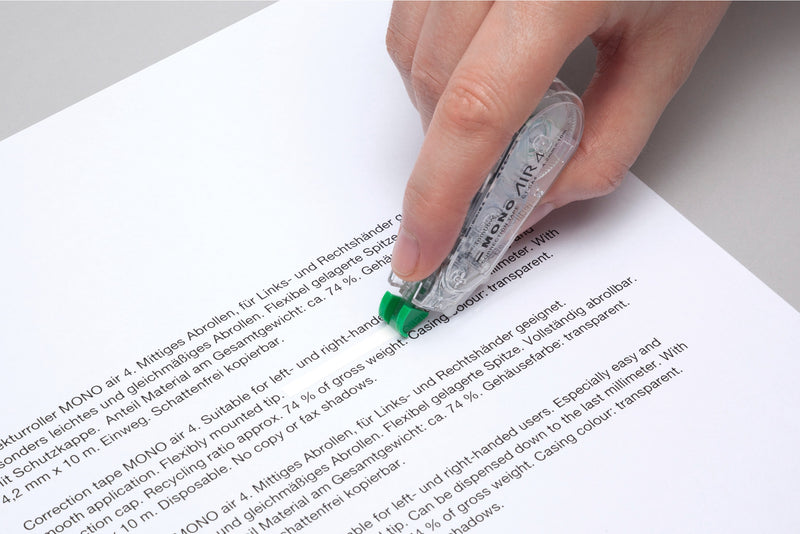 The correction tape MONO air 4 guarantees an especially easy, smooth and silent application due to its new, innovative technology. MONO air glides especially smoothly over the table. Suitable for left- und right-handed users. No drying time - can be written over instantly and cleanly. Perfect coverage, no copy or fax shadows. Clean and easy application also on uneven surfaces due to flexibly mounted tip. Handy casing with protection cap. Recycling ratio over 50% of gross weight. 4.2 mm x 10 m.