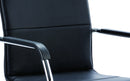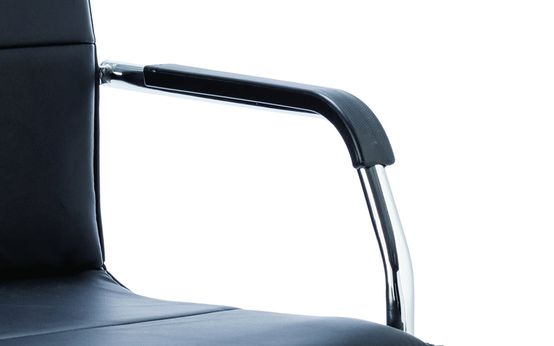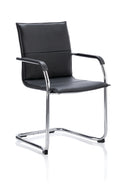 Sleek design meeting chair is ideal for boardrooms with its unique all in one soft leather shell, curved chrome frame and padded arms this chair offers a designer look for those on a budget.