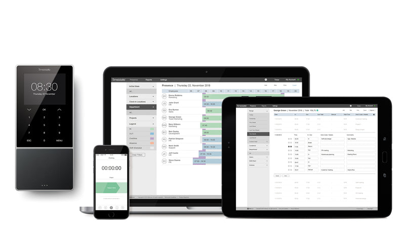 Save time and money by choosing our Mifare powered clocking in devices. Besides regular registration with a RFID badge or PIN the TM-818 SC also supports Mifare clocking, allowing users to manage their time registration, access control, personal identification and cashless transactions with just one badge. Your facility operations have never been easier.