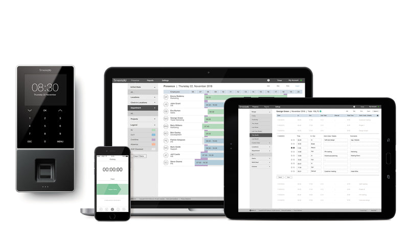 Save time and money by choosing our Mifare powered clocking in devices. Besides regular registration with a fingerprint, RFID badge or PIN the TM-828 SC also supports Mifare clocking, allowing users to manage their time registration, access control, personal identification and cashless transactions with just one badge. Your facility operations have never been easier.