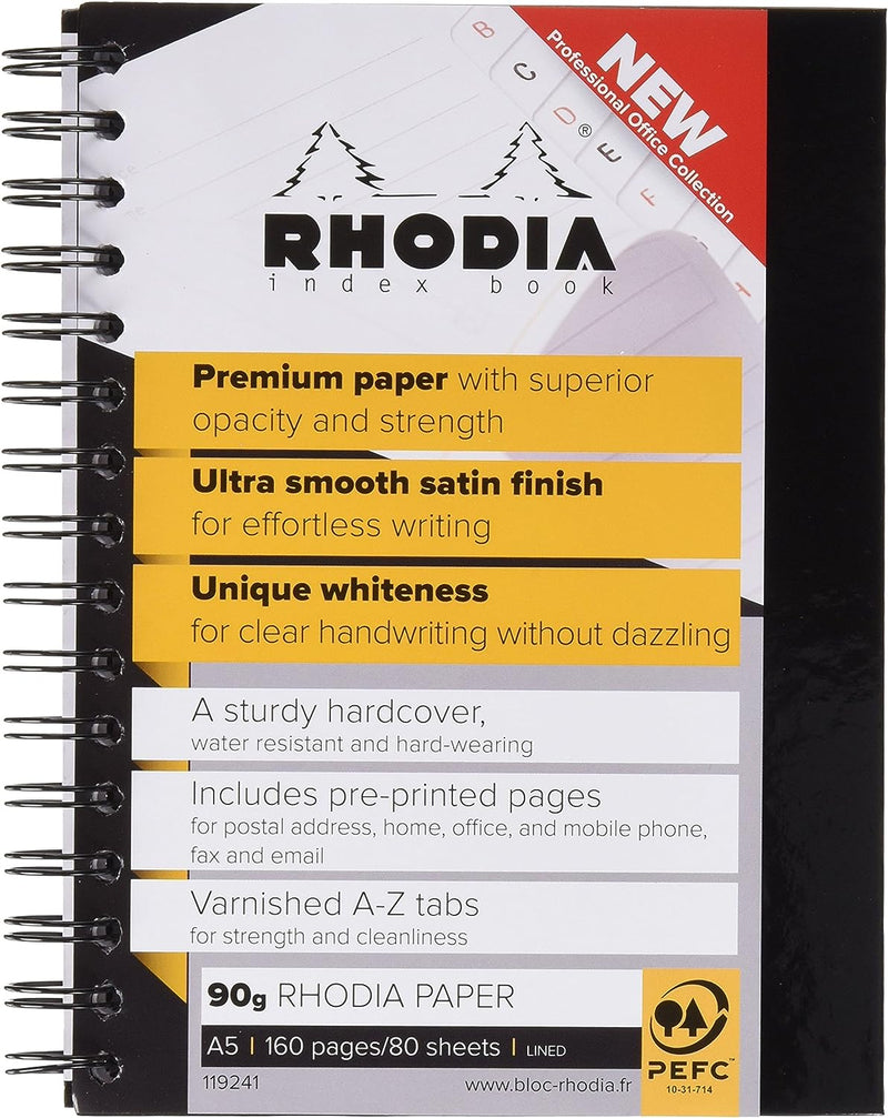Rhodia A5 Wirebound Hard Cover Business Book A-Z Index Ruled 160 Pages Black (Pack 3) - 119241C