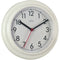 White kitchen clock with black arabic numbers and hands. Red second hand.