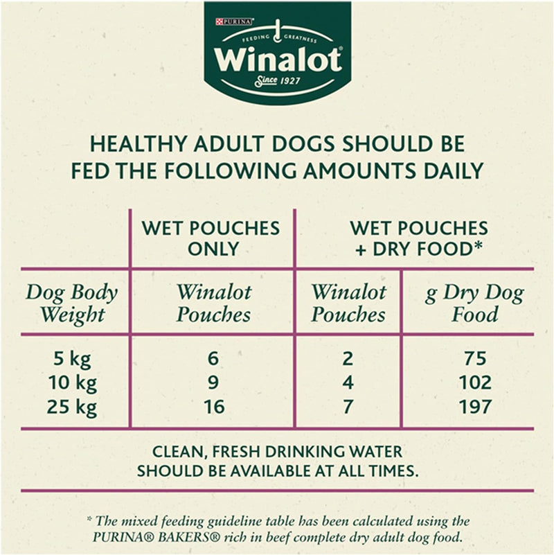 The Purina Winalot Perfect Portions Chunks Dog Food in Gravy contains a high amount of protein, low carbohydrate and a considered quantity of essential nutrients and minerals. The protein helps build strong bones and muscles while vitamins, such as A, D3 and E, maintain their eyes, skin and coat. The iron content promotes agility and vitality and other minerals such as zinc, iron and manganese balance their diet.